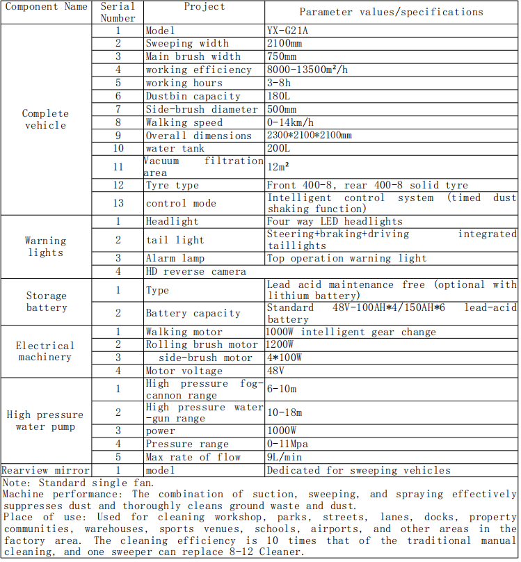 İstifadənin yeri: Təmizləmə seminarı, parklar, küçələr, zolaqlar, doklar, sakinlər, anbarlar, idman yerləri, məktəblər, hava limanları, hava limanları və digər ərazilər üçün istifadə olunur. Təmizləmə səmərəliliyi ənənəvi təlimatdan 10 dəfədir və bir süpürgəçi 8-12 təmizləyici əvəz edə bilər