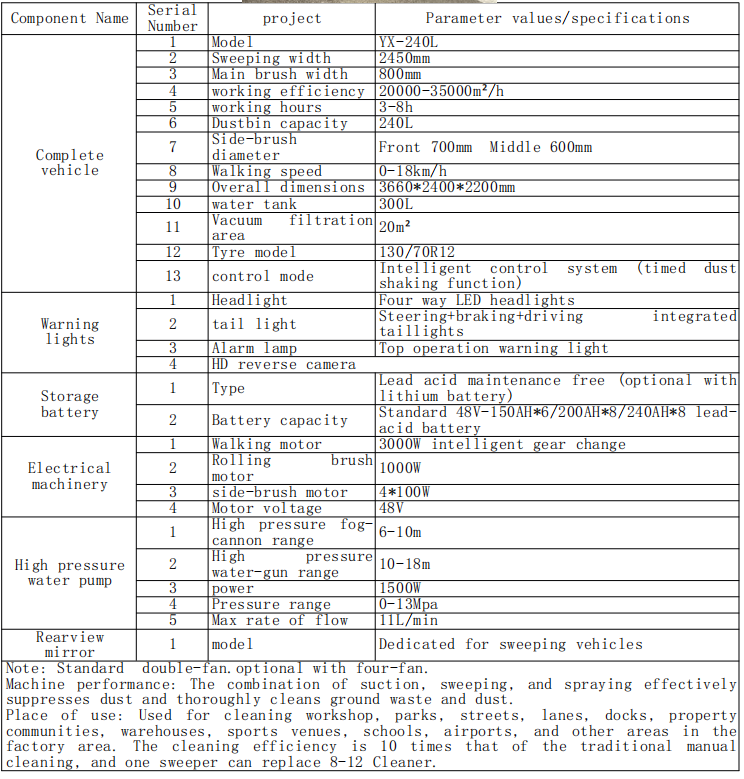 İstifadənin yeri: Təmizləmə seminarı, parklar, küçələr, zolaqlar, doklar, sakinlər, anbarlar, idman yerləri, məktəblər, hava limanları, hava limanları və digər ərazilər üçün istifadə olunur. Təmizləmə səmərəliliyi ənənəvi təlimatdan 10 dəfədir və bir süpürgəçi 8-12 təmizləyici əvəz edə bilər.