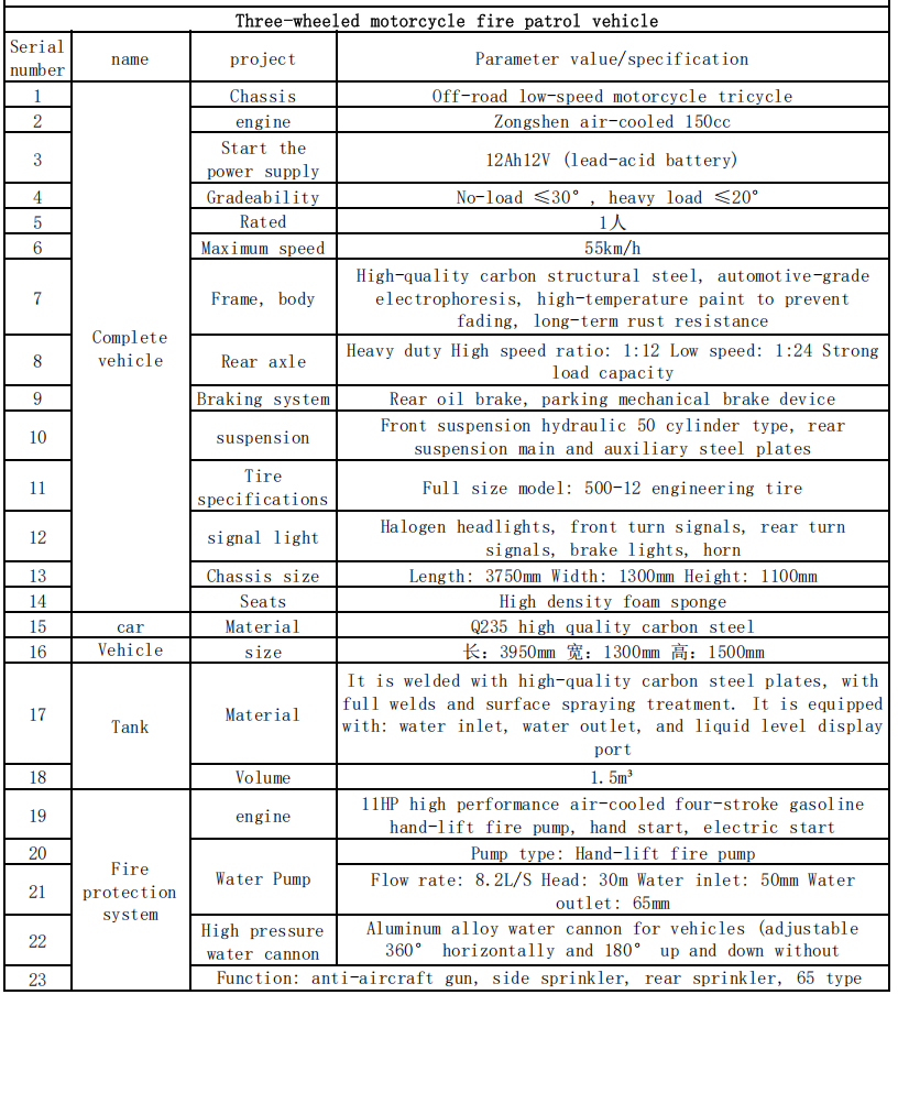 Kənd yollarının aşağı dərəcəsi və yanğınsöndürmə stansiyalarından olan uzun məsafədə, üç təkərli yanğın motosikleti şəhərsalma peşəkar yanğınsöndürmə briqadalarının əsas avadanlıqları kimi istifadə edilə bilər. İki təkərli nəqliyyat vasitələrindən daha çox tədarük edə bilər və dörd təkərli yanğınsöndürən maşınlardan daha çox mürəkkəb yol şəraiti üçün daha uyğunlaşa bilər, "Yaxınlıqdakı polis göndərmə və sürətli atılma".